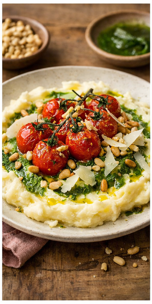 Een troostend maar verfijnd gerecht waarbij luchtige stampot wordt bekroond met zachte, gekarameliseerde tomaatjes en een levendige groene rucola-olie.
