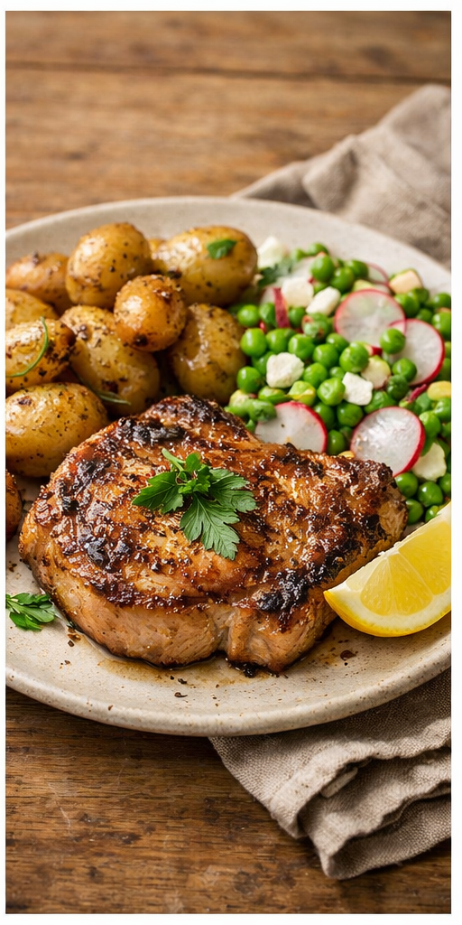 Sappige karbonades gebakken met knoflook en verse kruiden, geserveerd met knapperige jonge aardappels en een frisse erwtensalade met radijs, geitenkaas en muntvinaigrette.